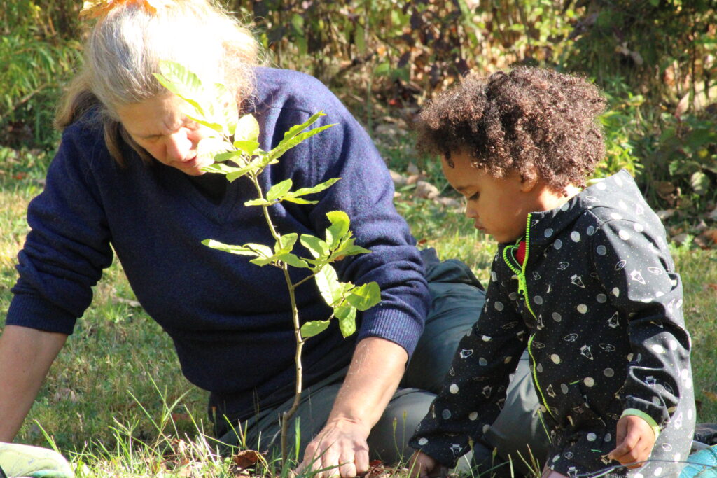 Grabbing buckets and cups from the sandbox, we all set off up the hill. The sun filtered beautifully through the new fall leaves, covering 4-H acres in a golden hue. The children were eager to weed and spread wood chips around the young saplings at the edge of the field.